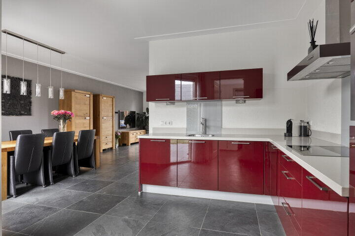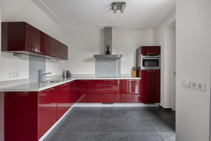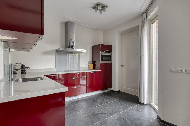 De open keuken ligt centraal in huis en is voorzien van diverse inbouwapparatuur, ideaal geplaatst voor wie graag kookt en tegelijk contact houdt met de rest van het gezin of je gasten aan tafel. Direct achter de keuken ligt de praktische bijkeuken – met witgoedaansluitingen én toegang tot de inpandige garage met extra bergruimte. Een fijne, functionele indeling die klopt.