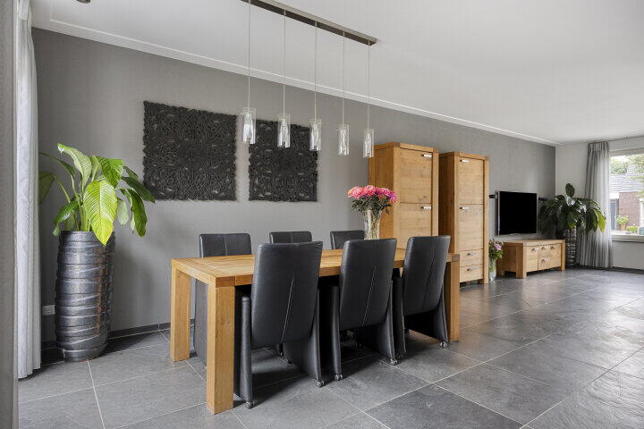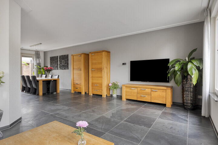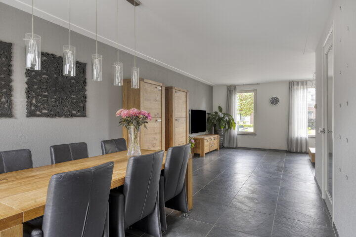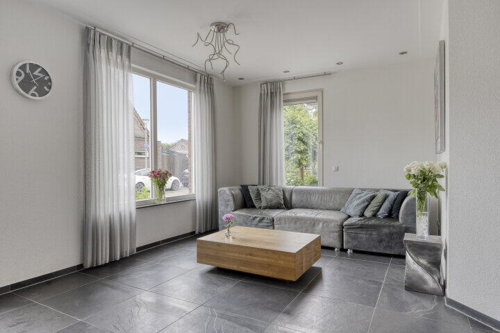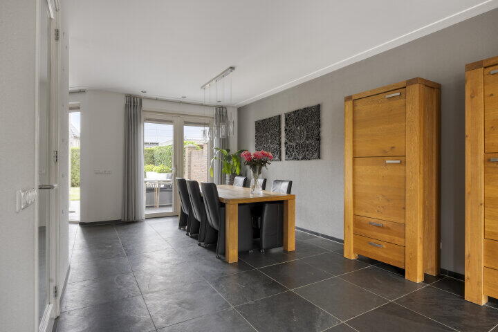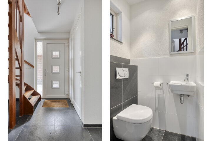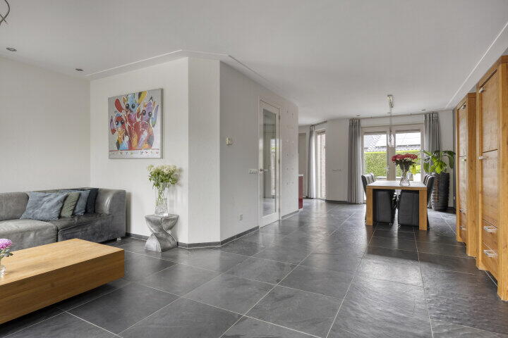 De ruime oprit brengt je via de carport naar de voordeur. Je komt binnen in een royale hal met toilet en trapopgang. Vanuit hier stap je de woonkamer in – bijna 6 meter breed, met grote ramen en veel lichtinval. Dankzij de dubbele openslaande deuren loop je zo de tuin in, waar je 's middags en 's avonds heerlijk van de zon geniet. De vloerverwarming zorgt het hele jaar door voor aangenaam comfort.